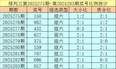 上期回顾:排列三第2025283奖号开出057,奖号质合比为2:1,大小比为2:1,跨度为7,类型为组六。