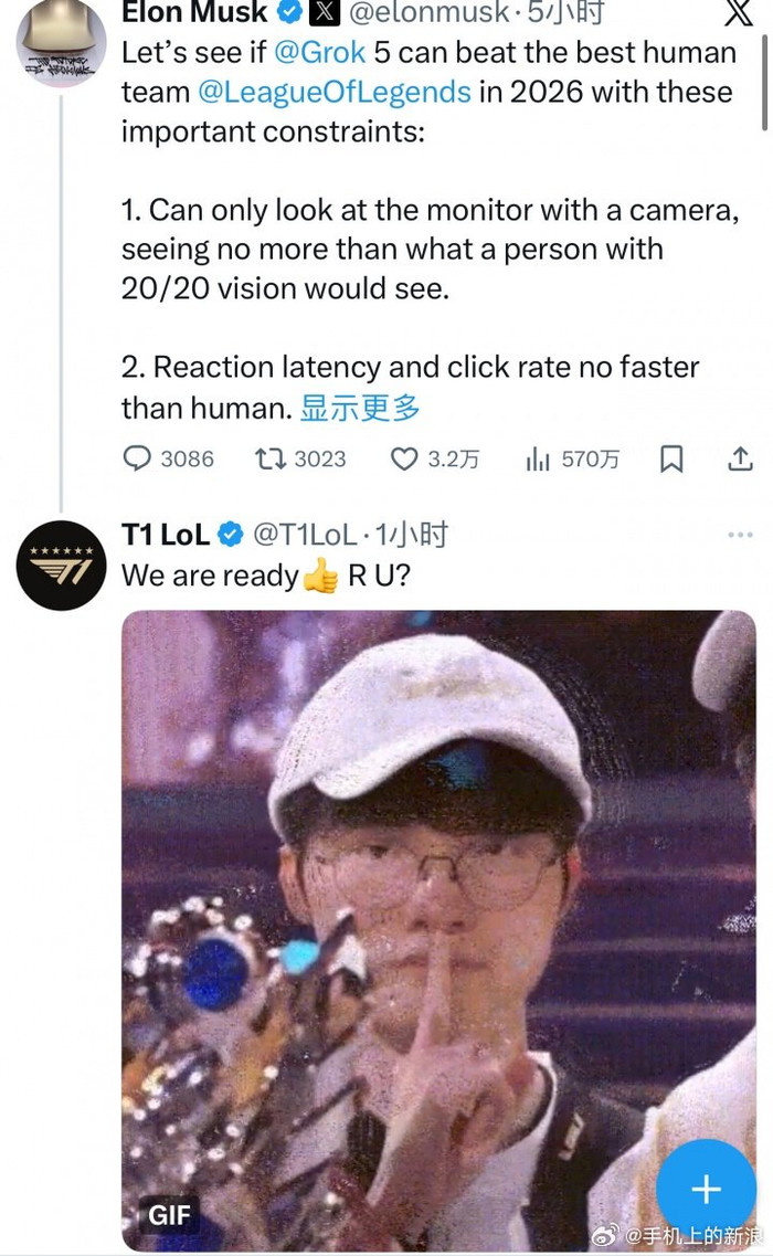 #T1回应马斯克的AI挑战#[T1官推回应马斯克AI挑战全球LOL最强队伍:“T1已经准备好了!”]#T1回应马斯克称已经准备好了#直播吧11月25日讯全球首富ElonMusk今天在X平台更新推文,宣布旗下AI平台(Grok5)将在未来挑战一支顶尖《英雄联盟》人类战队。