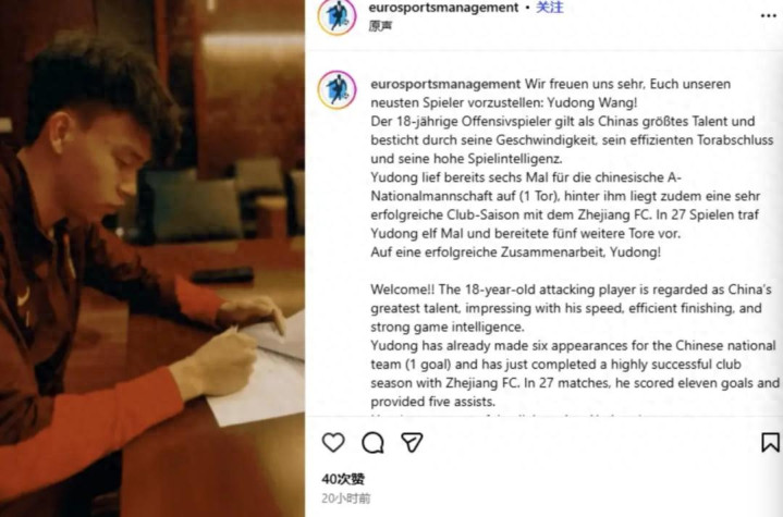 欧洲经纪公司Euro sports management官方宣布,与现年18岁的中国前锋王钰栋完成签约。这家公司的名字或许陌生,但它背后的球员名单却足够震撼:莱万多夫斯基、多特前锋拜尔、布伦特福德前锋沙德......