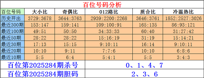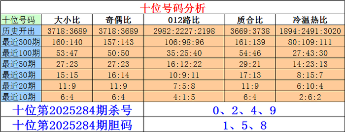 近期十位偶数表现较冷,目前遗漏2期,本期适当关注偶数回补;该位温冷号码近期出现较少,最近3期连续开出温冷号码,本期防温冷号码继续回补。十位杀号:0249,胆码关注:158。