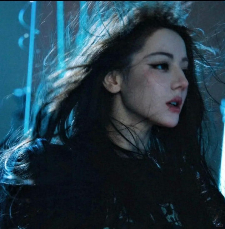 她顶着一头乌黑发亮的长发出场,穿黑色皮质抹胸配不对称牛仔裙,脚踩厚底长靴,乍一看确实飒到飞起。