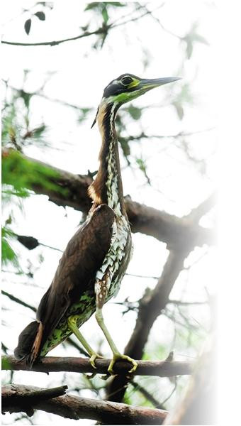 我是一只海南鳽,国家一级保护动物、世界濒危物种,一个用翅膀丈量绿水青山的“夜隐者”。我的形体与鹭相似,嘴长、颈长、脚长,披着一身暗褐色飞羽,在月光下会泛出神秘的绿色金属光泽。因为昼伏夜出、行踪莫测,而被列入“世界最神秘的鸟类”的行列。