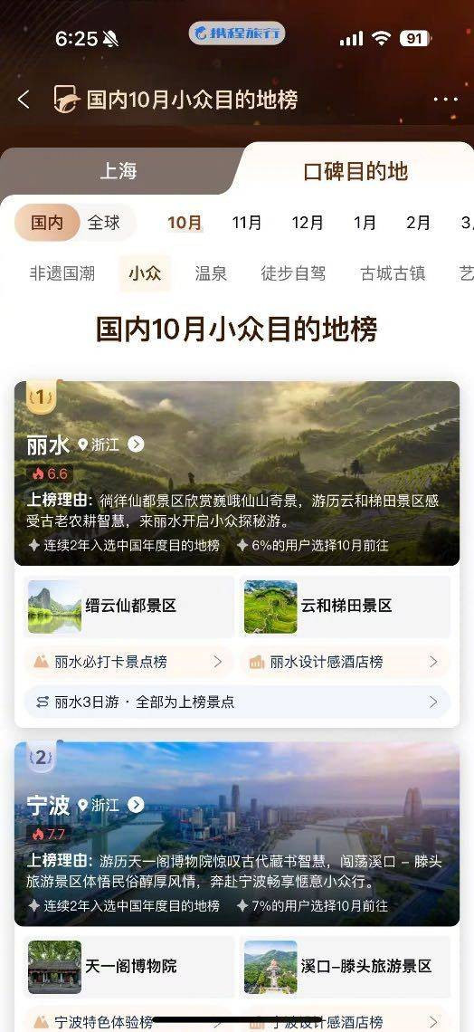 同样入选小众榜单的沿海城市也可以说是“名气不大、体验饱满”,惠州双月湾的半月形海面与巽寮湾原生态渔家文化,让这里连续入选年度目的地榜;宁德霞浦的“塞尔达”式海岛与太姥山“一线天”奇观,把福建的南国山海一次性打包,携程平台数据显示仅有5%用户表示10月会前往,却拥有江西境内最高的特色体验景点总数占比。这些“低热度、高评价”的特质,使它们成为口碑榜剔除人潮后仍能保证体验质量的优选。携程口碑榜负责人指出,通过数据算法与真人验榜的交叉验证,能够把“值得去”与“去得值”同时呈现给用户。