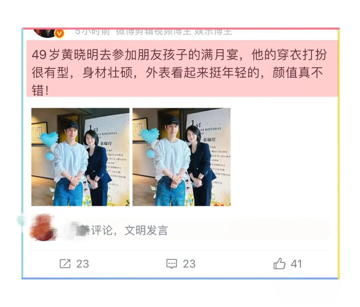近日有网友在网上晒出一张照片,偶遇黄晓明参加好朋友家孩子满月宴。